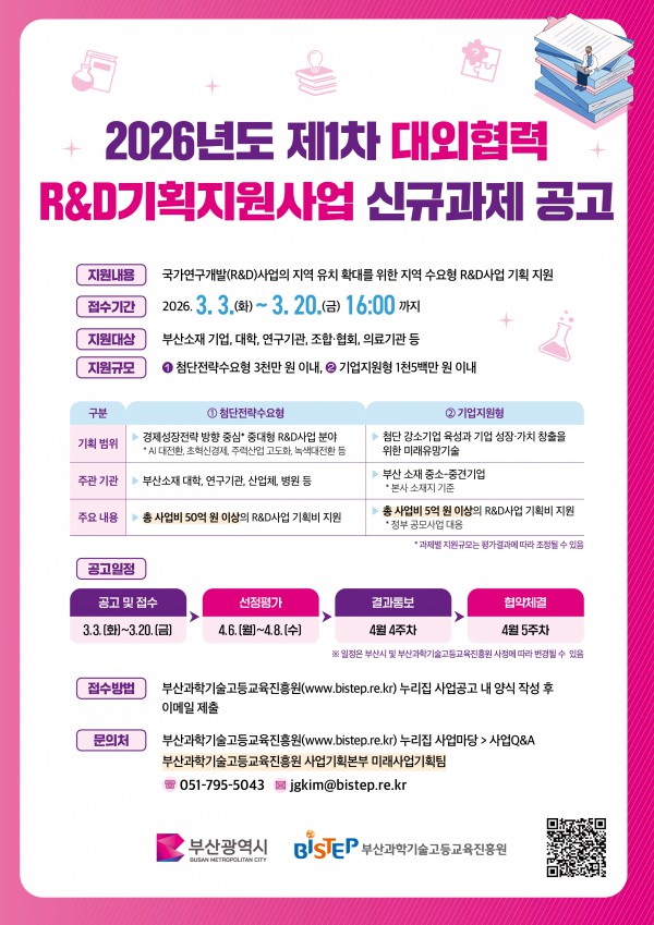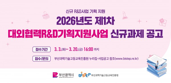 1. 부산광역시와 우리 원에서는 지역에 필요한 연구개발사업 기획 및 지역산업 경쟁력 강화를 위한‘2026년도 제1차 대외협력R&D기획지원사업’공모를 시행합니다.
